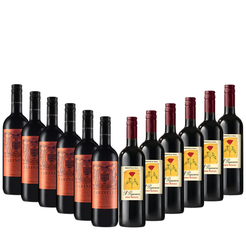 Indulge in 12 bottles of Italy’s finest reds—6 bottles each of:
